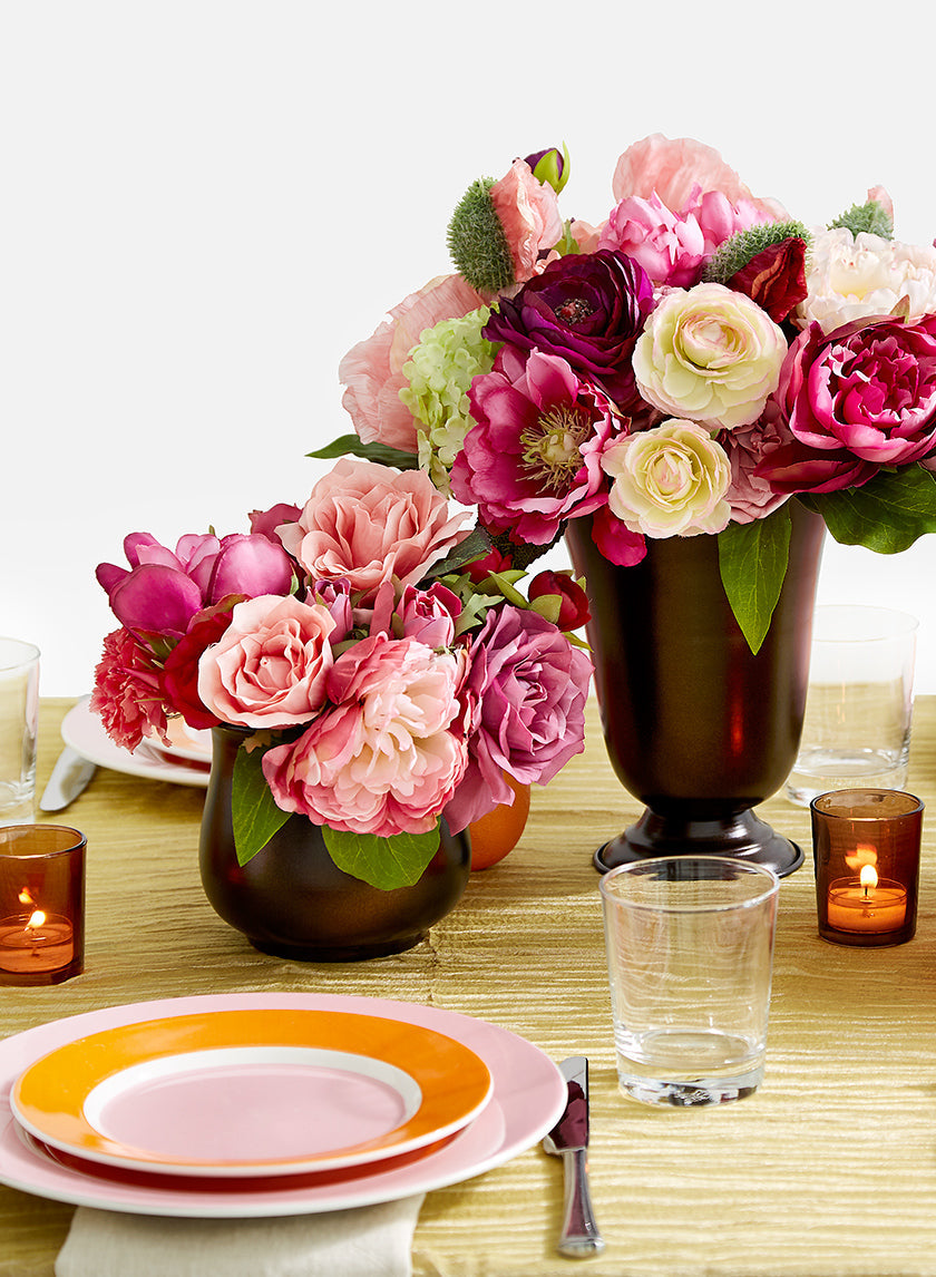 The Flowers cream peony pink peony flower bunch pink peony hydrangea silk flowers pink rose bouquet ranunculus bunch grape ranunculus spray The Vases We used a mix of three antique copper and black metal containers with similar shapes for the centerpiece arrangements. This 5in antique copper bowl (shown at right), this similar black nickel urn (center), and this similar ombre frost glass vase. We used floral tape across the top of each vase to create a grid for these flower arrangements that are made entirely out of silk flowers (don't they look incredibly real?!). The Table & Place Settings Add a subtle glitter and visible texture to the tabletop itself with fabric that has the look of crepe paper, or a dupioni silk tablecloth. Play up the bright colors of the centerpieces with colorful plates like these pink and orange ones. The Accessories Finish with candlelight to set the mood. These dark amber votive holders match the antique color of the vessels. Oranges add some more color to the tablescape, and here they also match the color of the plates, but any seasonal fruit with either a great color or beautiful texture would look great. As a fun takeaway, your guests can also each take an orange home for a snack.