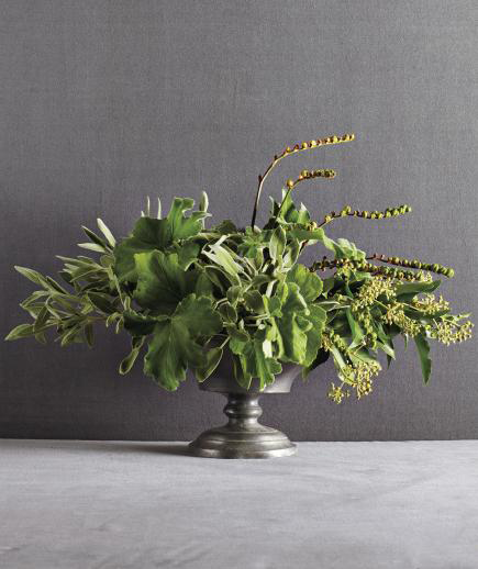 The gray mid-tone of antique platinum is the perfect frame for an all-green leafy arrangement. In the arrangement below, a grouping of soft, textured green leaves in a platinum bowl is a chic and sophisticated centerpiece option for your Thanksgiving dinner table.1. GO FLOWERLESS "This arrangement uses geranium (large,round, scalloped leaves), sage (fuzzy light green leaves), crocosmia seed heads (poking out the top), and ivy seed heads (hanging out below)." – Real Simple
