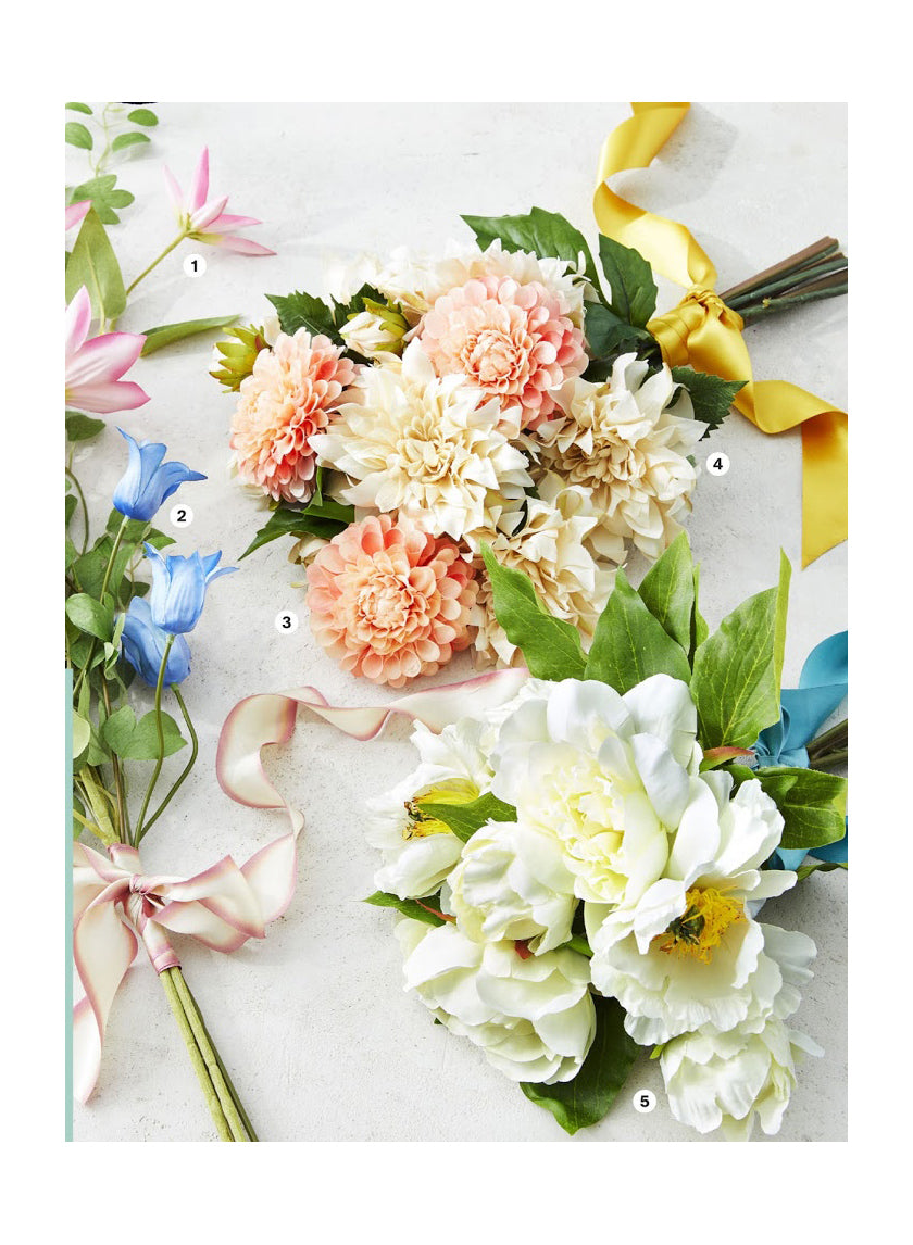 'Arrange the prettiest flowers—that no one will guess are fake. Next level details like fuzzy stems and variegated petals make the latest faux flowers look totally legit. DIY your bouquet for your destination wedding—then bring it home to decorate your place.' – BRIDES. Silk flowers are the stars of these wedding bouquets; bellflower with our clematis and our cream peony flower bunch. When you get back, our ranunculus bunch and white cosmos spray are parts of a casual display in a bud vase and graphic can perfect for a kitchen windowsill. Go tropical for an unadorned corner with an arrangement of protea, phoenix palm leaf, bird of paradise, and our anthurium spray.