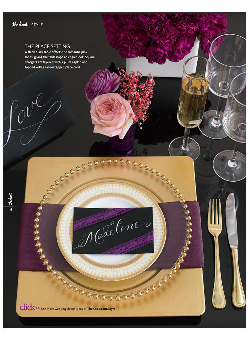 THE TABLE Soft flowers, elegant calligraphy, modern furniture and gold accents create a romantic table setting that's rich but not too fussy. – GAY WEDDINGS from the knot
