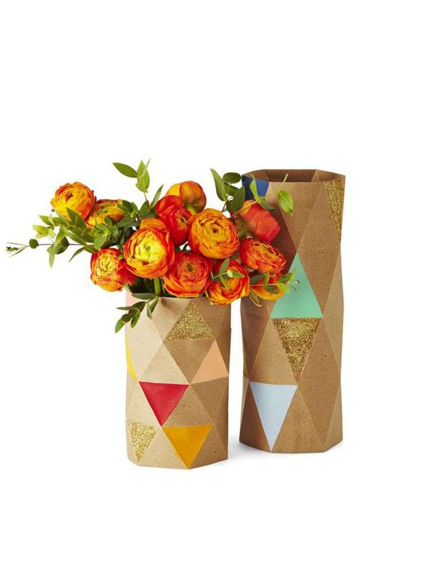This Thanksgiving, dress up a plain glass vase (and hide flower stems) with this DIY idea from the November issue of HGTV Magazine. Create this paper bag faceted vase, embellished with glitter and colored triangles, using our 7 1/2- and 10-inch tall cylinder vases. Get the how-to.