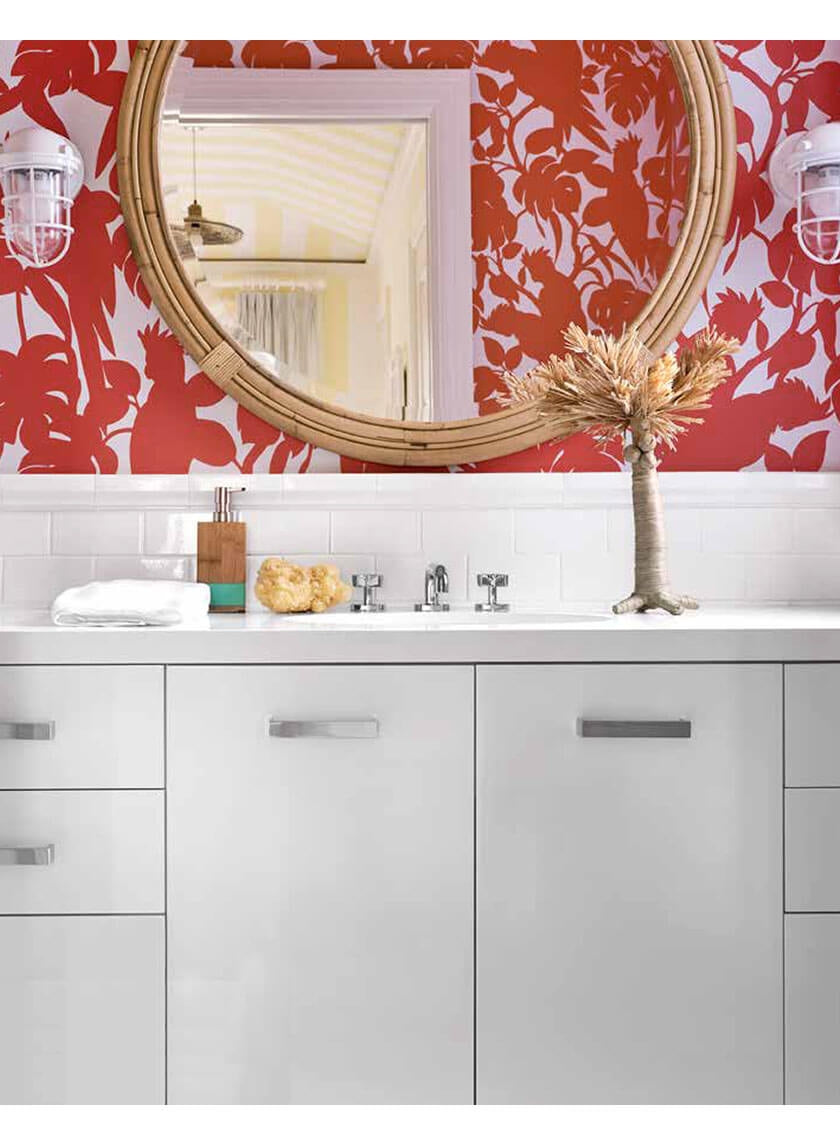 Brilliant orange birds on the Cockatoos wallpaper by Florence Broadhurst enliven the kids' bathroom. "Inspiration hit the moment I spotted it," Lane says. "What child wouldn't love that upbeat and vibrant print?" An oversized mirror, trimmed in bent and split rattan and flanked by nautical-inspired steel-cage sconces, holds its own against the bold walls and keeps the permanent-holiday look going. To tuck away towels and children's bath toys, the existing vanity was replaced with a custom cabinet with ample room inside. – House Beautiful
