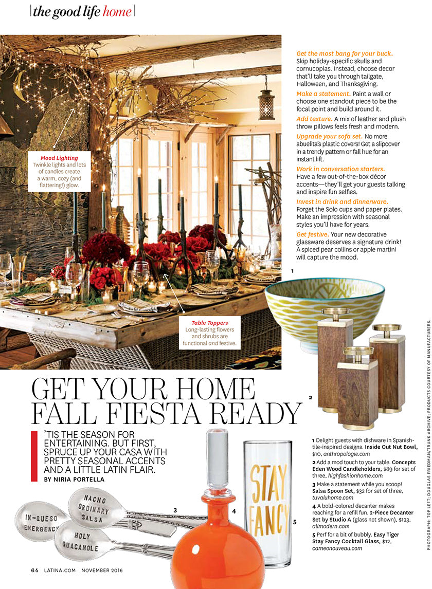 GET YOUR HOME FALL FIESTA READY with these ideas from the November 2016 issue of Latina. They chose our birch candles to bring a touch of nature to your living space. 'Tis the season for entertaining. But first, spruce up your casa with pretty seasonal accents and a little Latin flair.'