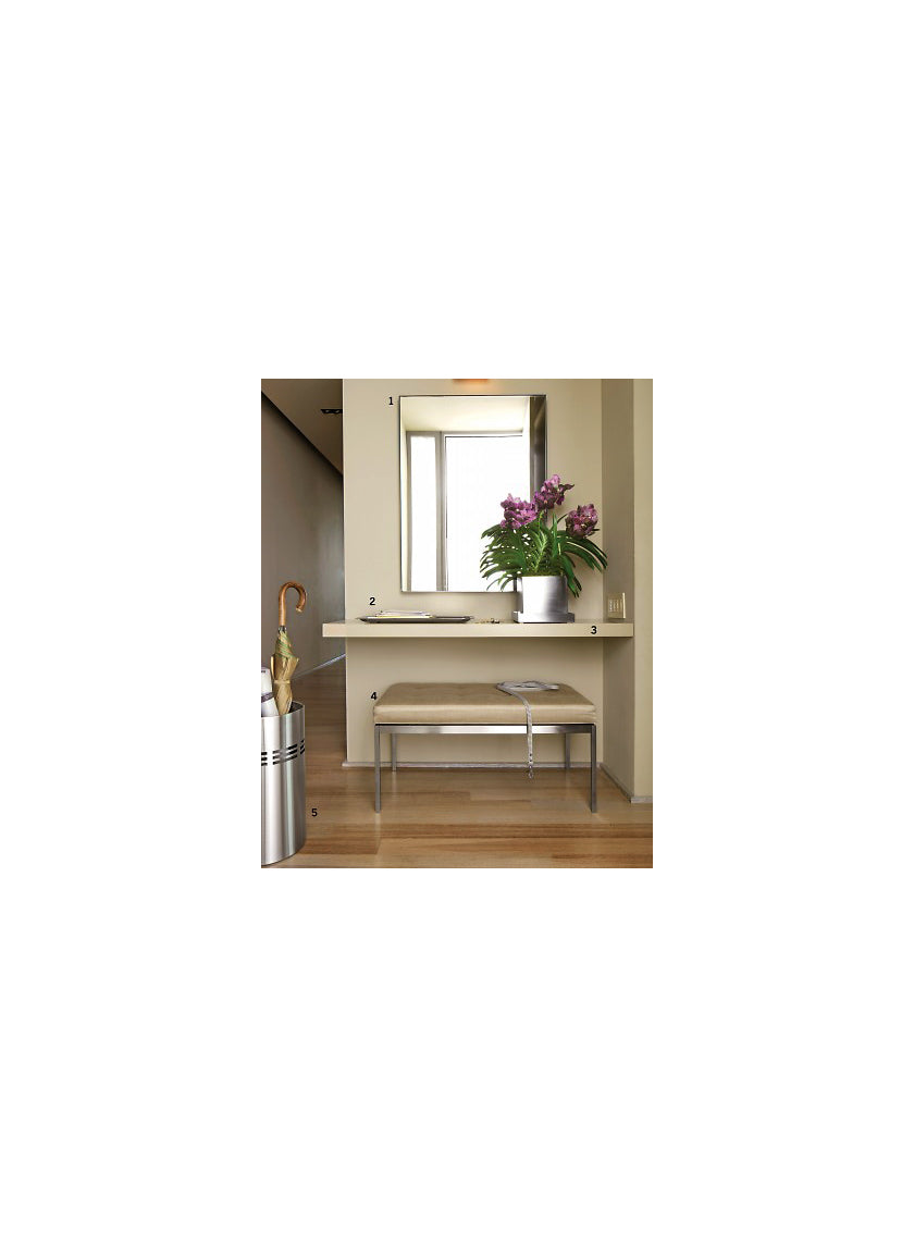 In 'Entrance Strategy', Kevin Sharkey outfits his foyer in a neutral palette, and the decor includes our 8-inch stainless steel cube and 10-inch square tray.