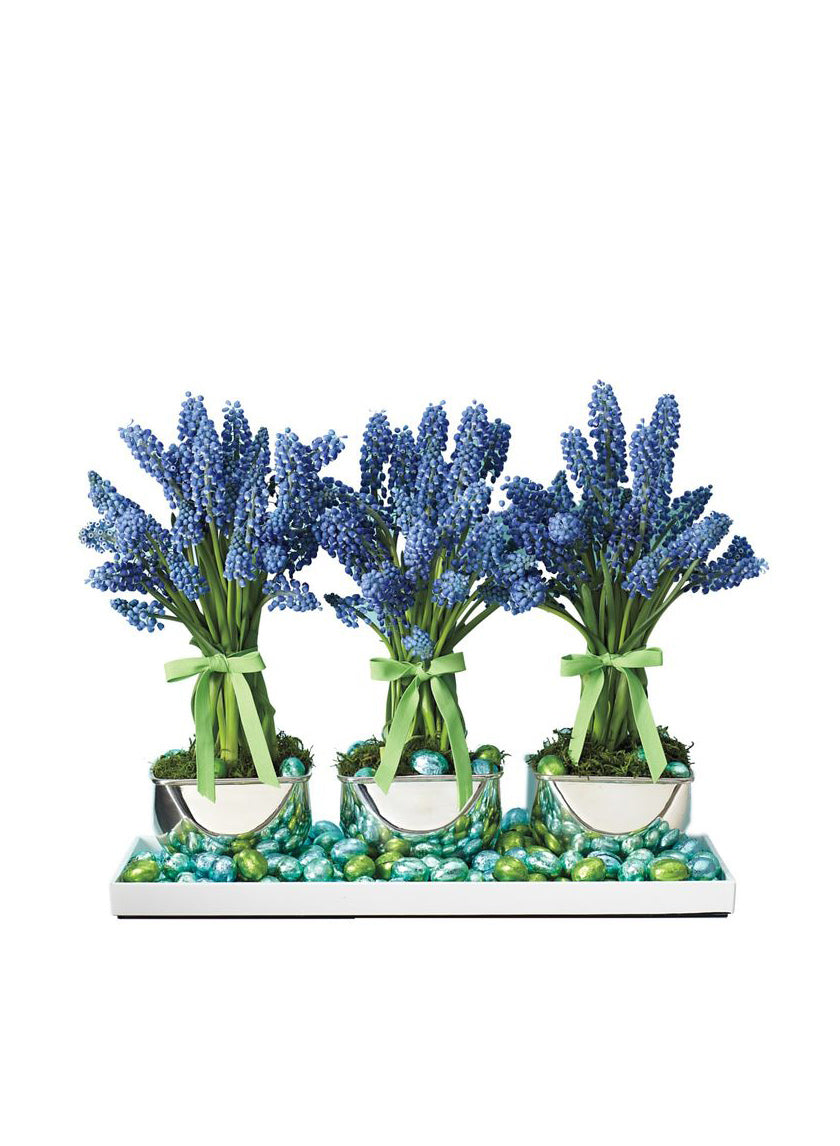 In this April 2012 issue of Martha Stewart Living, 'My Blue Heaven' by Kevin Sharkey shows these beautiful sheaves of muscari in a tray filled with Easter eggs. The muscari is tied with grosgrain ribbon, tucked into our nickel bowls, and topped with some moss. See the complete how-to.