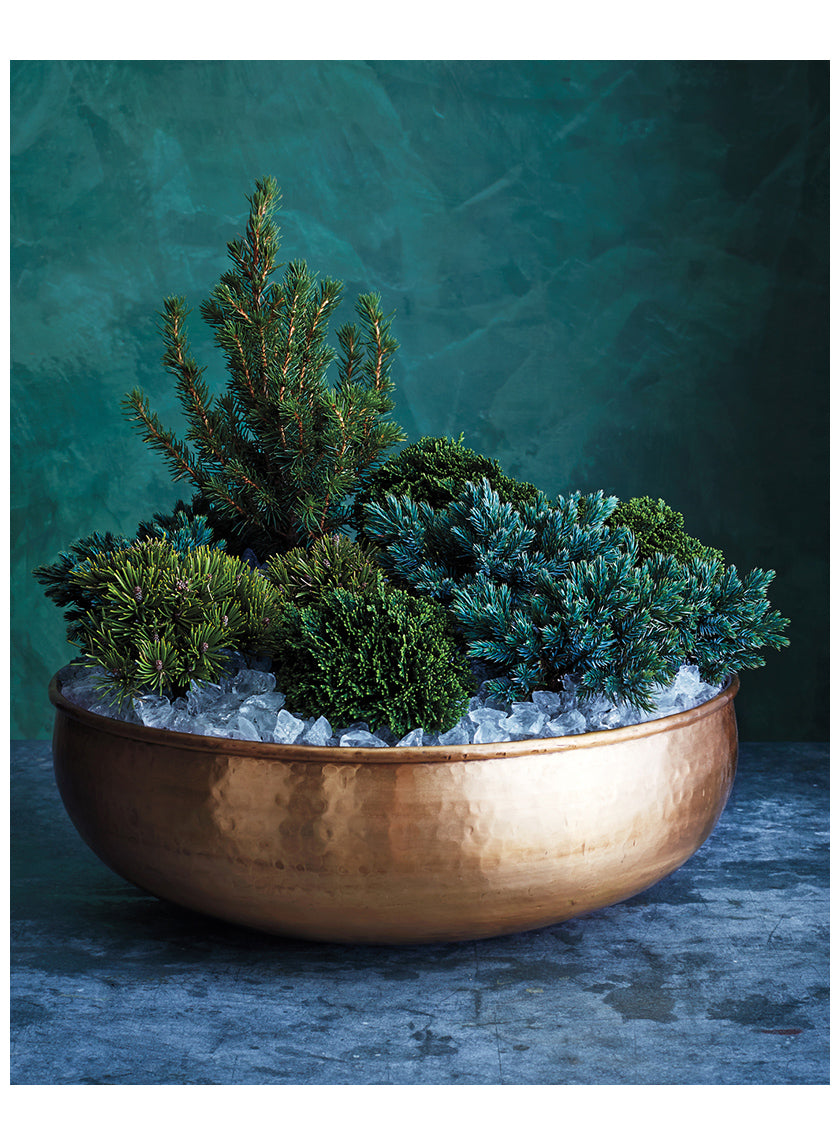 We dig this winter project in the December 2014 / January 2015 issue of Martha Stewart Living using our Hammered Brass Bowl to create "A Cluster of Conifers for a Festive Front Door Arrangement: Welcome guests with this elegant assortment of outdoor plants. A large brass bowl and icelike glass mulch elevate the grouping."