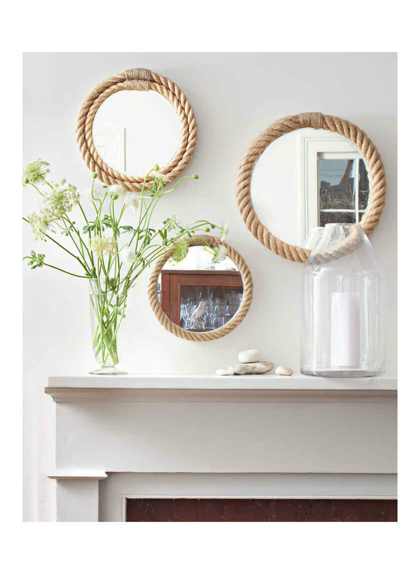 Loop lengths of sun-bleached rope around a few looking glasses, and you can deck out your home with the fairest maritime style of them all. Glue inexpensive mirrors onto slightly larger wooden cutouts, and adhere natural line, like (from left) manila, hemp, or jute. Finish the ends with jute twine using our quick whipping technique, and reflect on your handiwork. – Martha Stewart Living