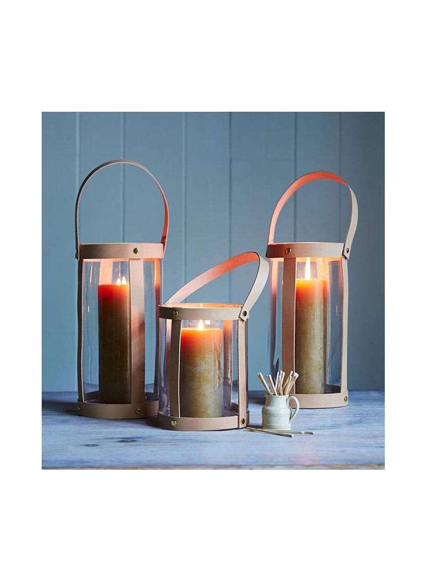 Our 6 x 8in and 6 x 12in glass vases turn into handsome leather-trimmed hurricanes with this DIY idea from the November issue of Martha Stewart Living. 'This take on a pared-down Scandinavian scene (no flowers necessary) gets its warmth from raw linen and the glow of beeswax candles. An informal arrangement of mottled gourds, leather-trimmed hurricane lanterns and whole nuts ready for the cracking makes a casually gorgeous centerpiece... To fill your dining room with golden light, group leather-trimmed lanterns holding beeswax pillars. A trio of varied heights is handsome enough to stand in for a flower arrangement, and comes together in minutes from basic materials: leather strips, brass fasteners and glass hurricanes. Note: The handles are decorative, not for lifting the lantern, and should be angled away from the candles' heat.' Get the how-to.
