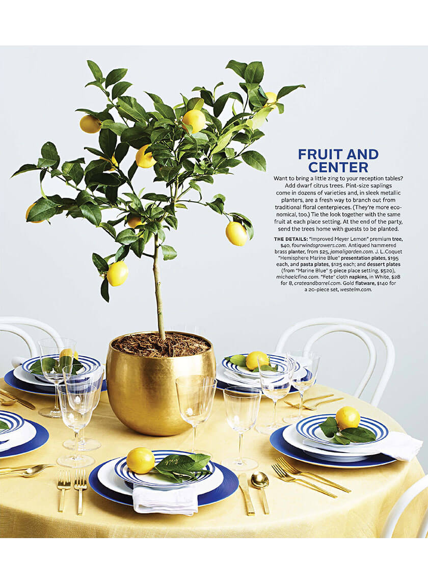 Want to bring a little zing to your reception tables? Add dwarf citrus trees. Pint-size saplings come in dozens of varieties and, in sleek metallic planters, are a fresh way to branch out from traditional floral centerpieces. (They're more eco- nomical, too.) Tie the look together with the same fruit at each place setting. At the end of the party, send the trees home with guests to be planted. – Martha Stewart Real Weddings & Honeymoons, Spring 2017