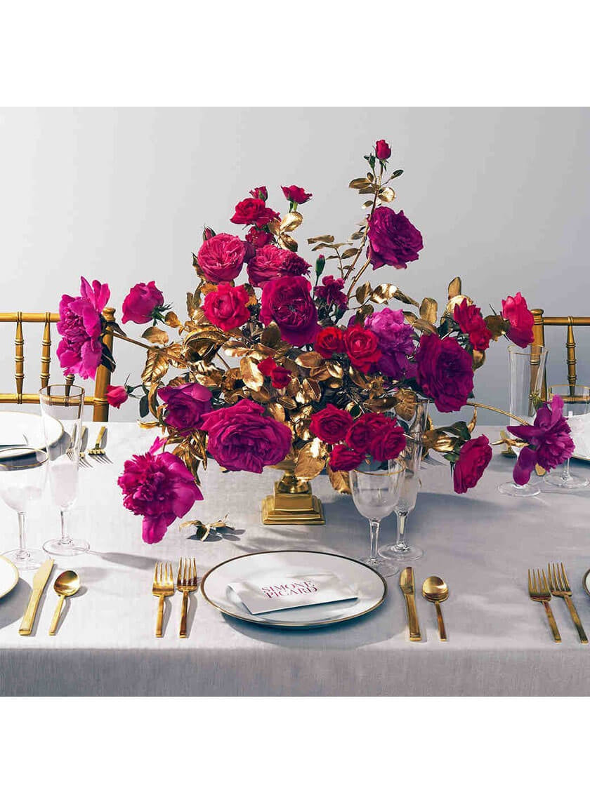 Magenta—redder than purple, deeper than pink—is a passionate color. You can employ it in small doses, tempered by a muted palette, but pair it with gold—in big, generous splashes— and you’ll have a look worthy of your most dramatic day.