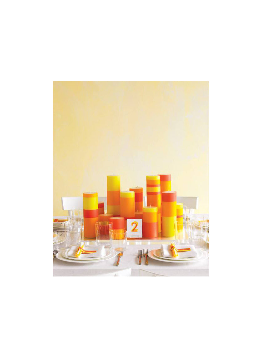 Go for color with this bold and modern, nonfloral wedding centerpiece that uses our white pillar candles from the Martha Stewart Weddings Summer 2010 issue: 'A big, vibrant pop of color in the form of bright candles you design yourself casts a warm glow over an otherwise clean, minimalist table.' Get the how-to.
