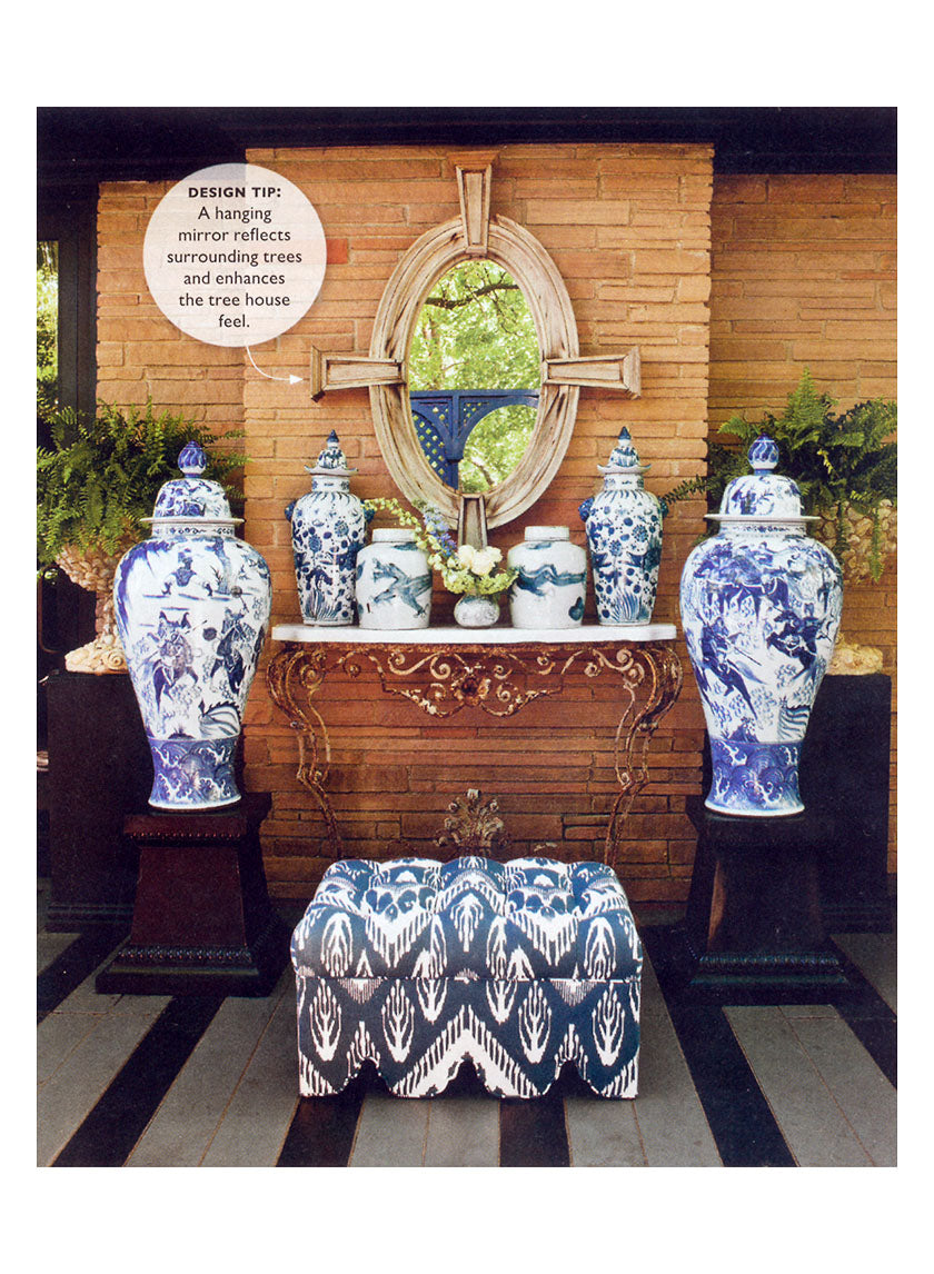 This terrace in the July 2012 issue of Southern Living, uses a color combo in abundance. Blue and white dominates this outdoor space with a blue and white seat and blue and white jars and vases. Get the look with our Blue & White Ginger Jar.