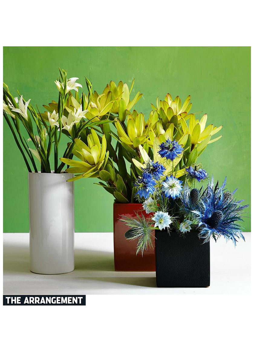 She massed groupings of flowers cut to similar heights into geometric ceramic vases: white mini gladiolas in a white cylinder, chartreuse leucadendron in a red cube and blue eryngium and nigella in a black cube.