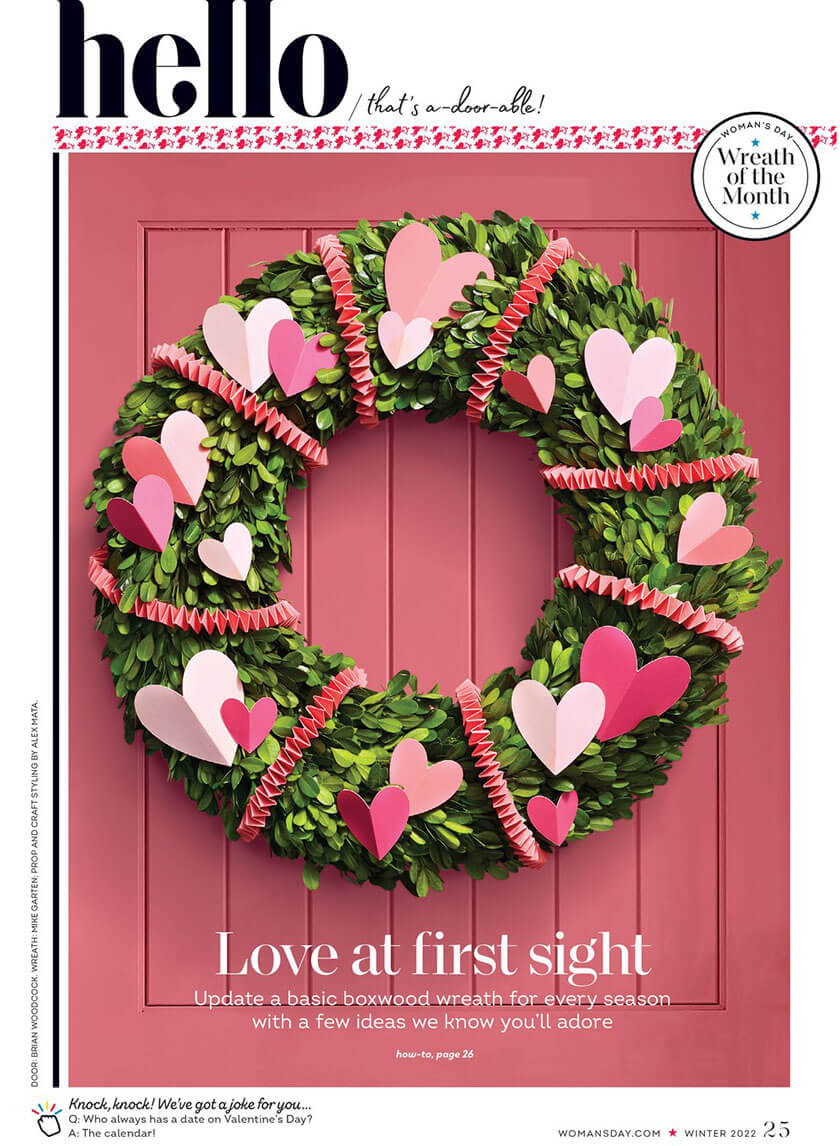 THAT'S A-DOOR-ABLE! Our boxwood wreath is adorned with pink hearts for Valentine's Day in the Winter 2022 issue of Woman's Day.