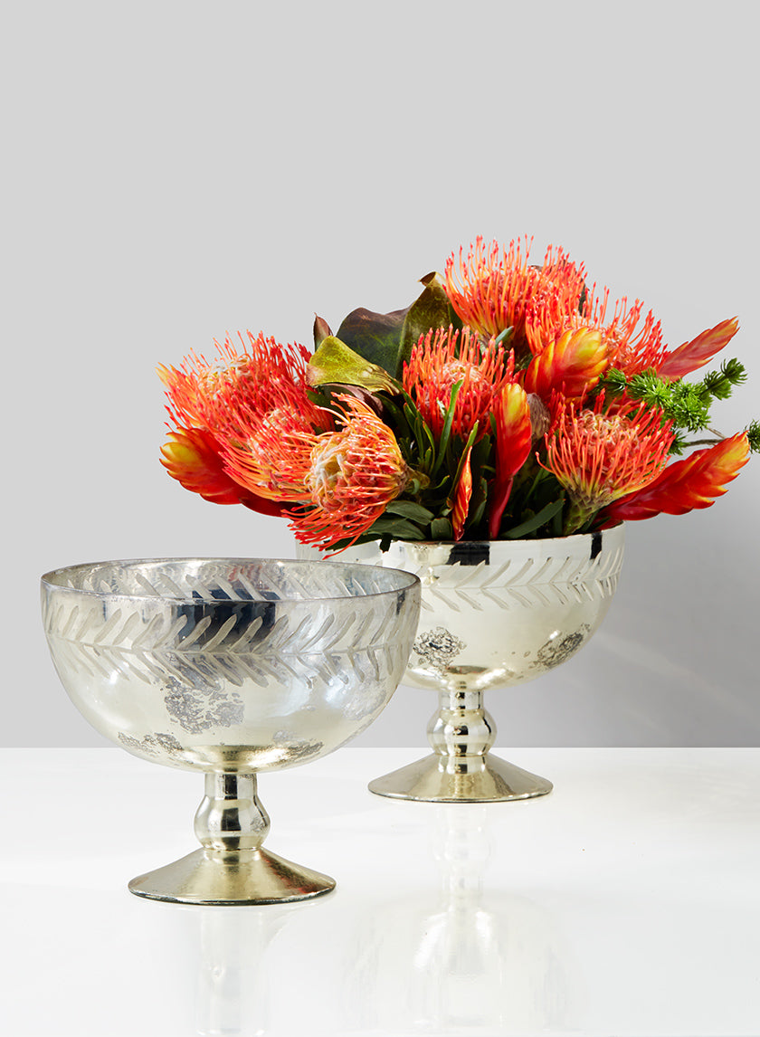 Centerpieces are a significant part of event decor. With the right centerpiece, you can add character and set the mood of your event. The 7 ½-inch etched leaf vintage mercury glass bowl is the perfect focal point for any centerpiece. Consider contrasting the antique silver finish with a brightly colored flower arrangement that features vibrant reds and oranges, such as the red jungle flame spray, to create an eye-catching and colorful centerpiece.