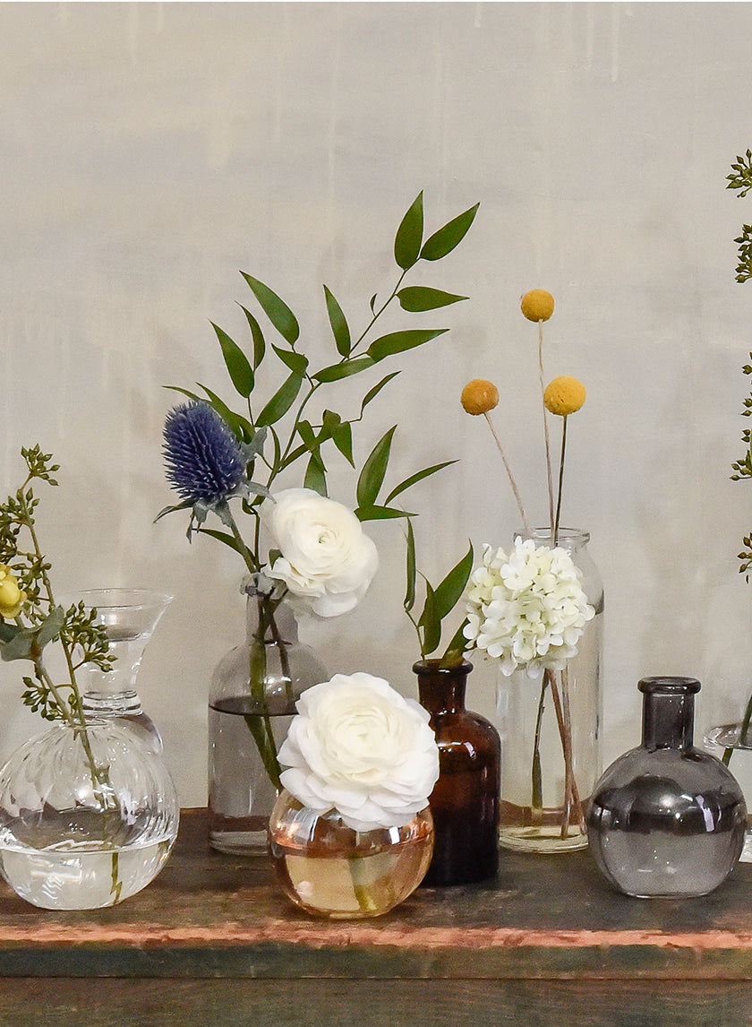 If you have a long table, place a runner or table cloth down the center and arrange your bud vases in a loose arrangement. You can include our clear glass ball bud vases, light amber bottle bud vases, and green medicine bottle bud vases, then fill them with a variety of artificial blooms to tie everything together. Weave a simple garland of artificial greenery around the bases of the bud vases to fill up the table.