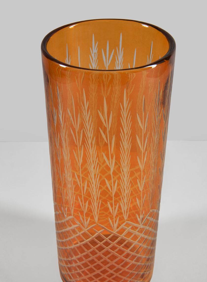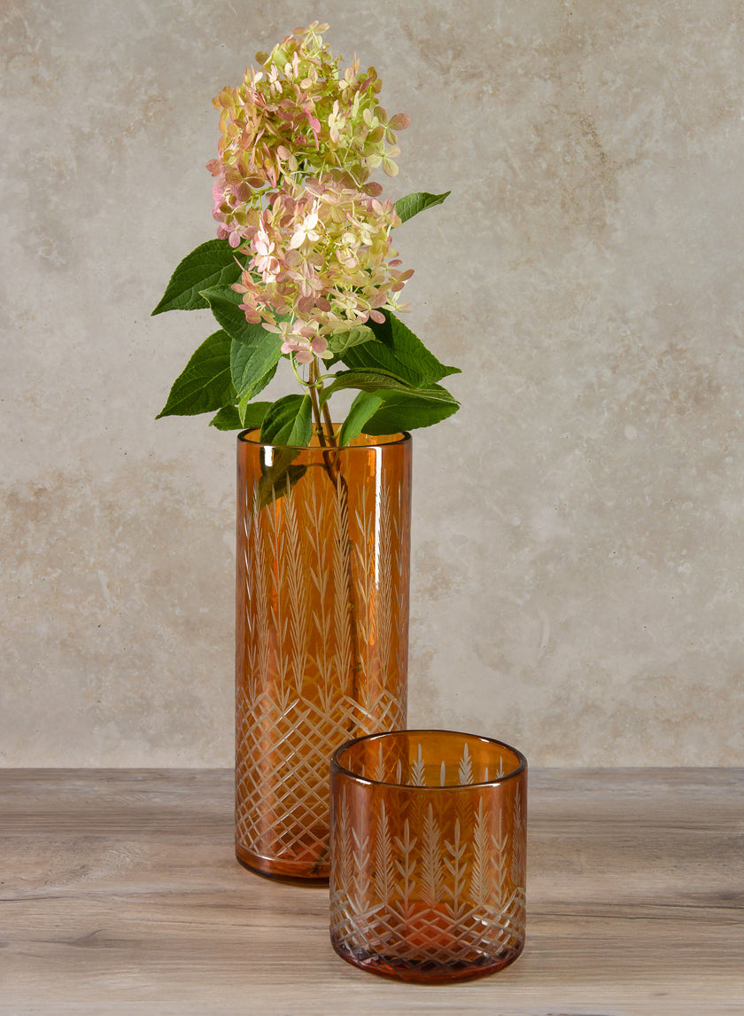 10in Tall Almira Palm Amber Cut Work Cylinder Glass Vase