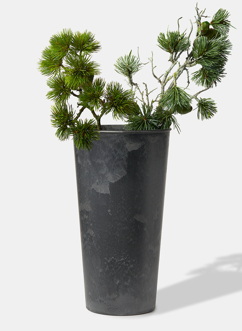 Give classic flower store buckets an upgrade with these aged black, plastic flower buckets. This large and heavy, durable plastic, tall flower bucket has a beautiful, marble-like finish to its outside. It's pretty enough to just use as a vase for display. Our bucket holds a few evergreen branches. Complete the look with our selection of matching flower buckets in a range of sizes.