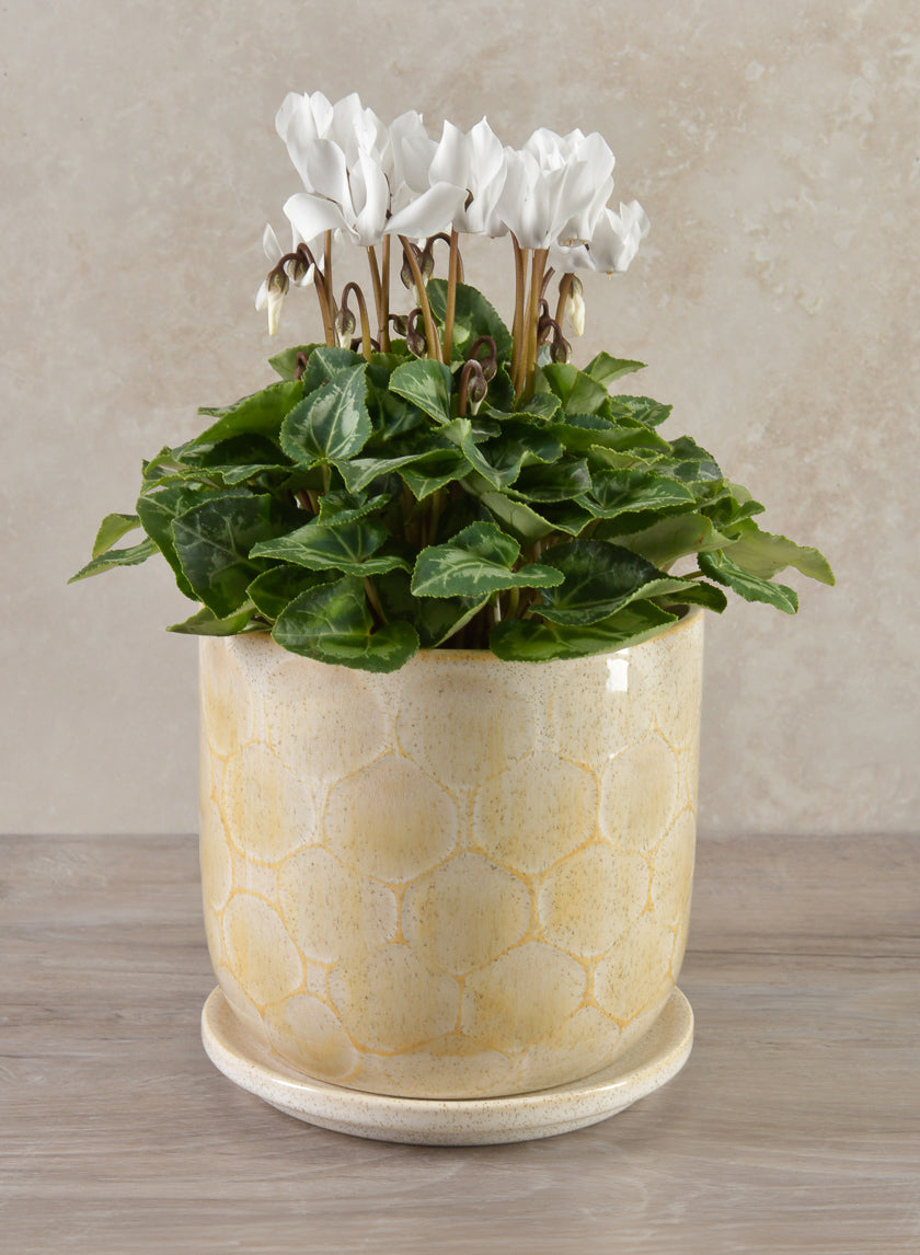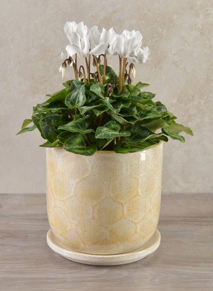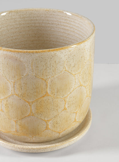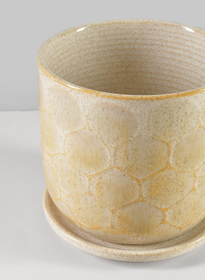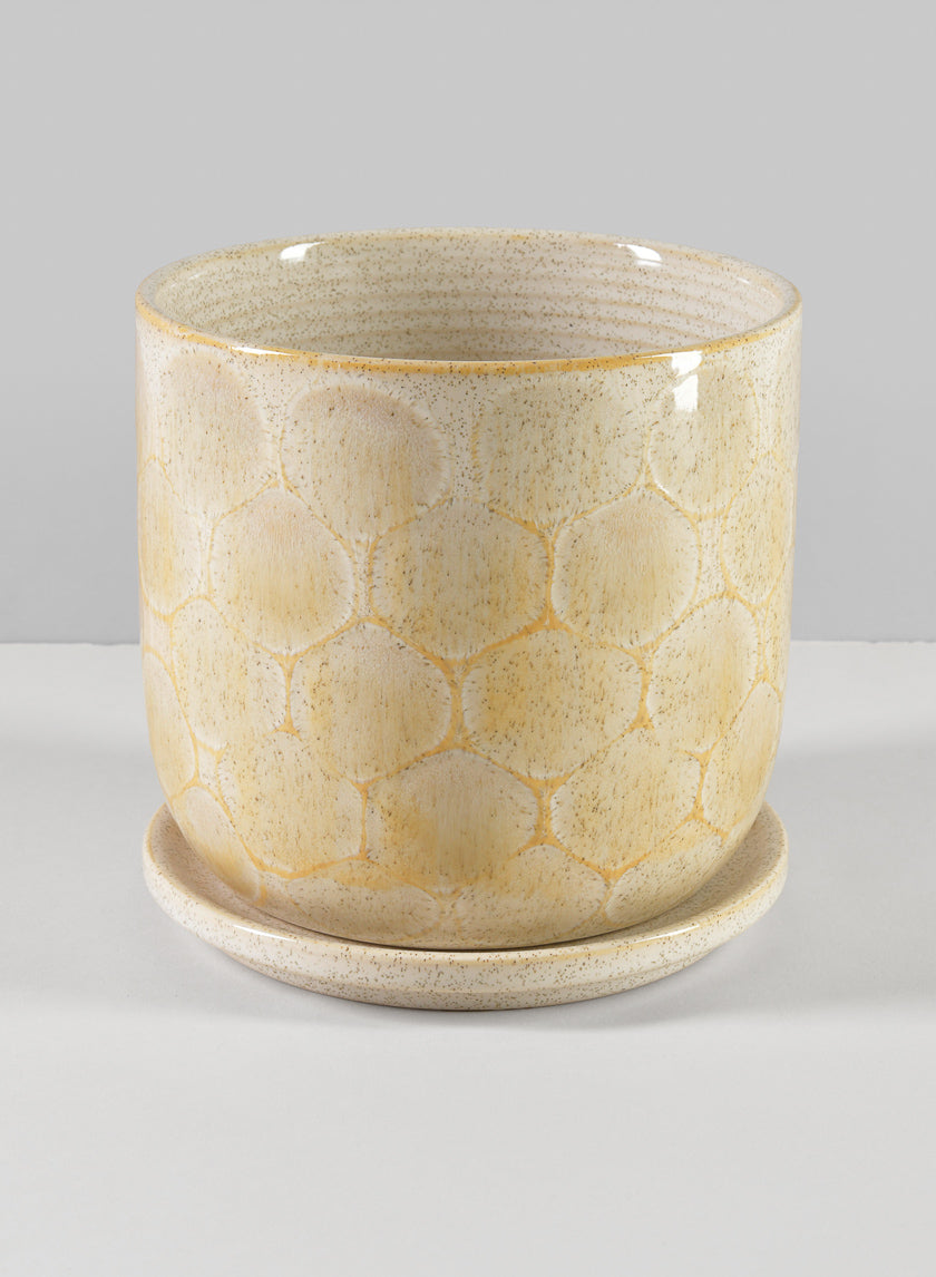 The Safaga Pot is an essential pot for any garden event decor thanks to its lovely honeycomb texture, cozy color scheme, and useful saucer.