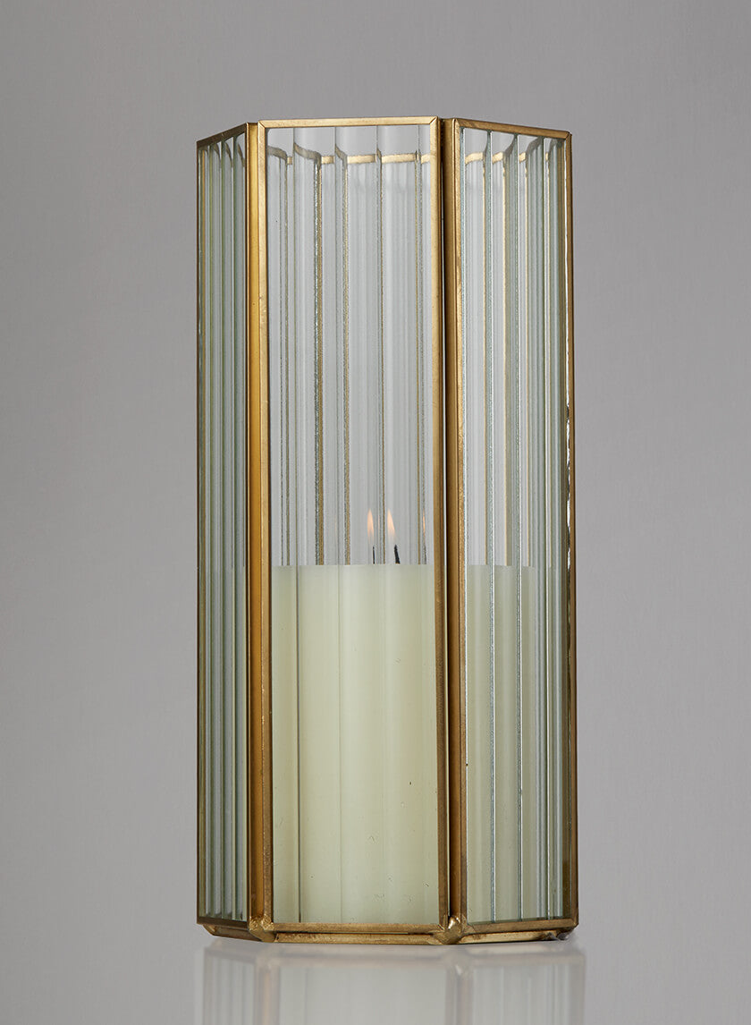 This metal candle hurricane has a hexagonal shape. Its gold frame holds six glass panels with a seafoam green hue and stripes that are created with a slightly thicker glass layer within the glass.
