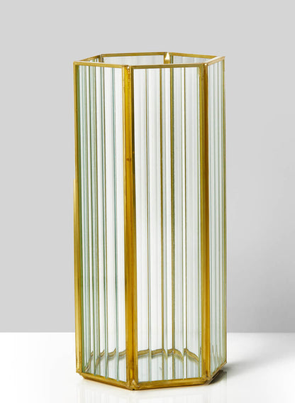 8.75in Tall Striped Glass Gold Hexagon Hurricane