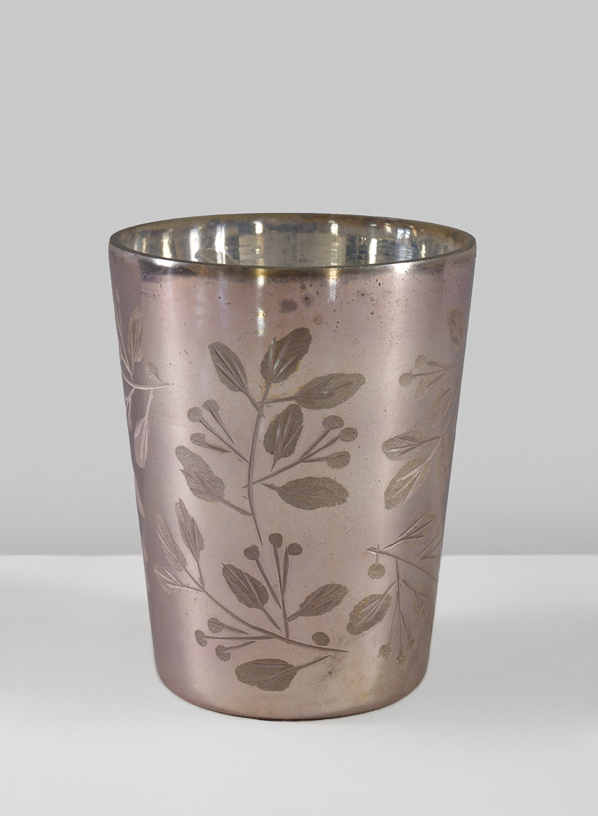 5in Tall Elizha Etched Leaf Burned Silver Glass Holder- Regular price