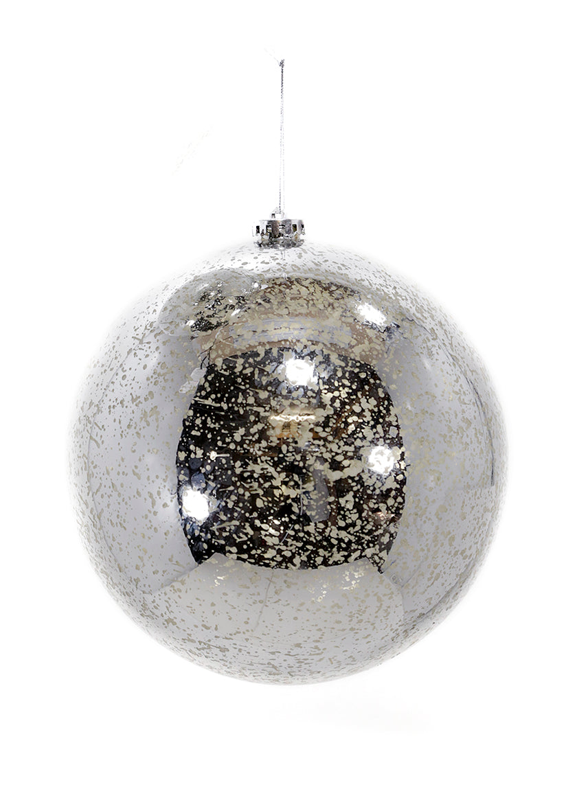 The silver mercury glass ornament ball can be seamlessly incorporated into a variety of home and party holiday decorations. The balls are 7 3/4 inches, ideal for stately Christmas trees that need a touch of sophistication. Each ornament comes with an attached silver wire for easy hanging. Intersperse silver mercury balls with other trendy ornaments for a unique holiday look.