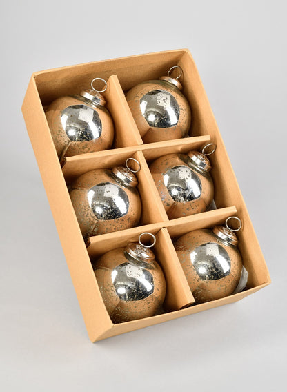 3in Round Antique Silver Ball Glass Ornament In Window Box, Set of 6