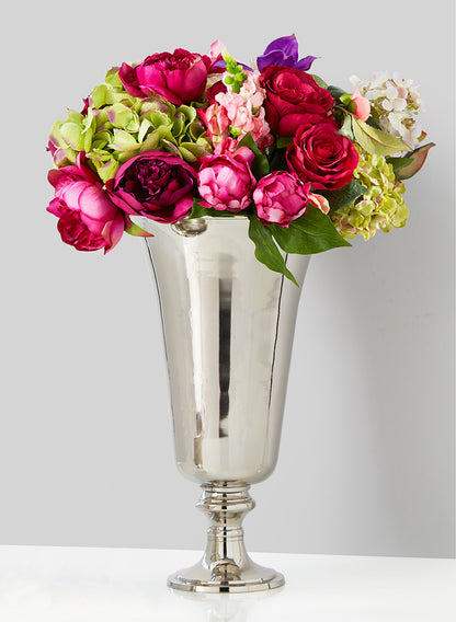 Create a lush centerpiece for your wedding or event, or create a large striking arrangement for a building lobby, bar, restaurant, in this tall urn. For the tables at your event, pair it with our nickel bowl that has a similar look. Our flower vase holds an arrangement of silk hydrangeas, peonies, and snapdragons. Nickel-plated aluminum.