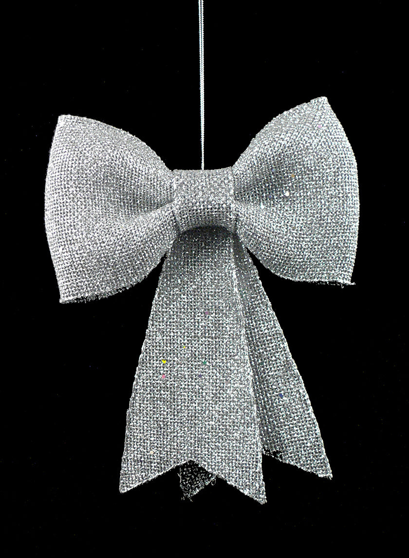 Celebrate Christmas. Put a bow on it: a window, a store window, a restaurant window, a very big Christmas present. This silver glitter bow comes on a silver cord for easy hanging.