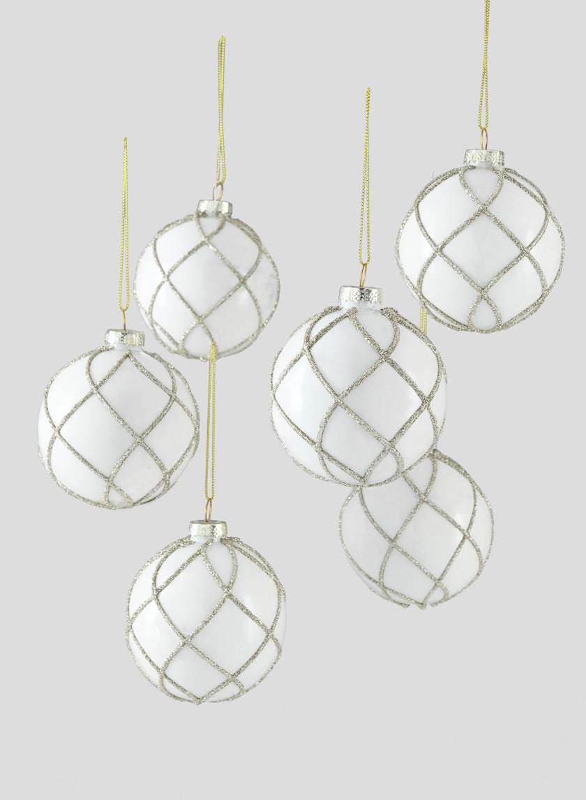 3in Round Glitter Swirl White Glass Ornament Ball, Set of 6