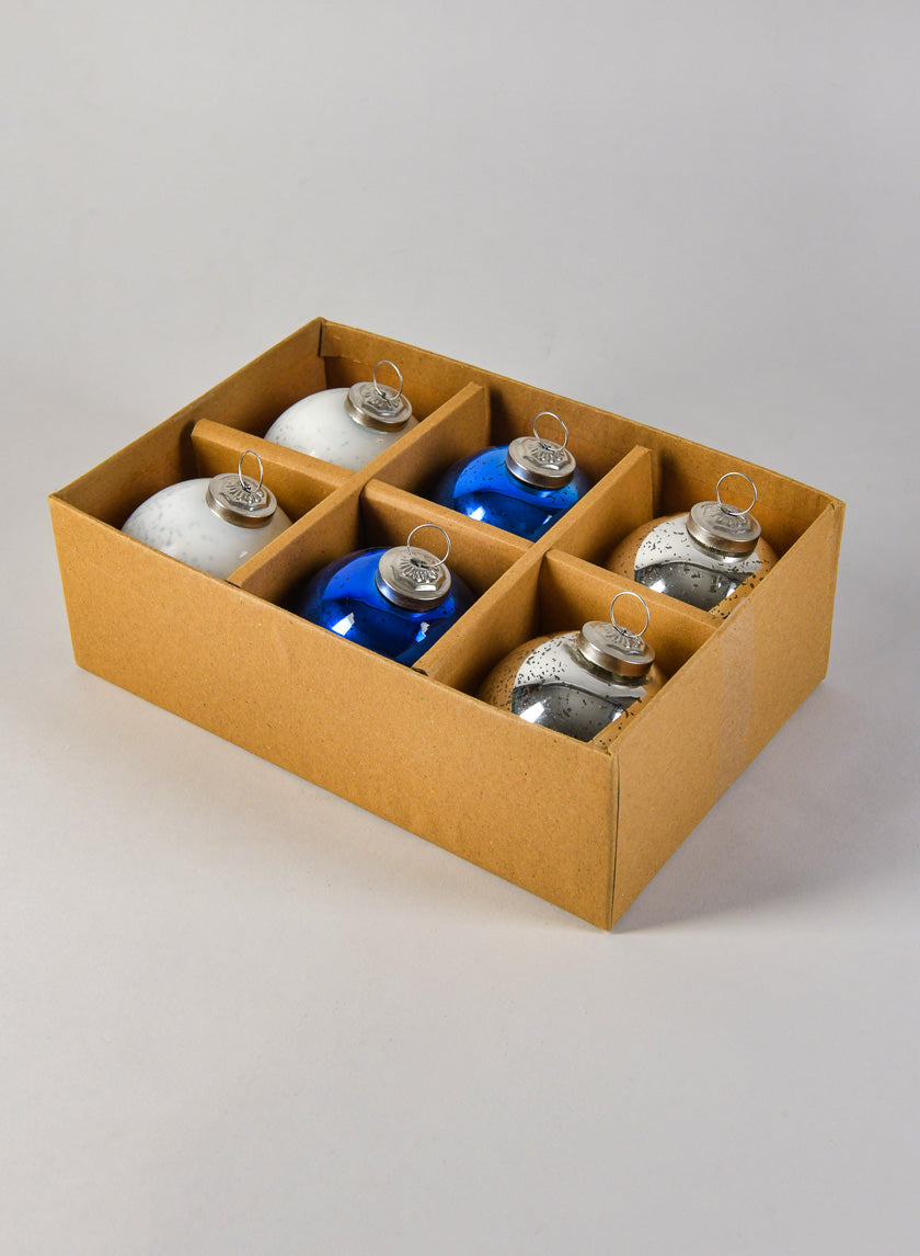 3in Round White Silver & Blue Plastic Ornament Balls with Silver Hook, Set of 6
