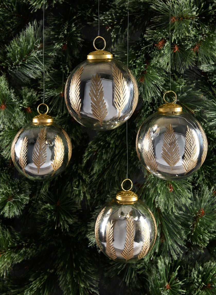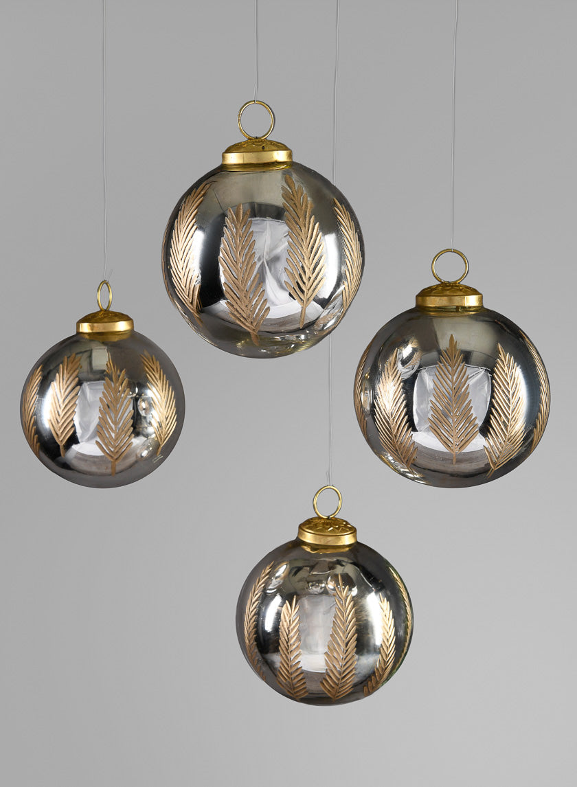 4in Round Al-Hambra Palm Leaf Silver Glass Ornament, Set of 4