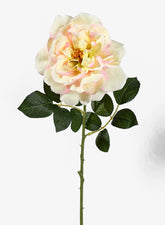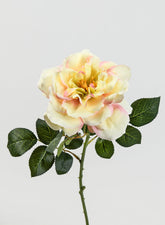 This beautiful silk Provence rose in full bloom is the Rosa × centifolia, also known as the Provence rose, cabbage rose or Rose de Mai, a hybrid rose developed by Dutch breeders between the 17th century and the 19th century. You'll love our artificial rose with its creamy, almost pale yellow rose petals that also have shades of pink on their edges. Make an entire rose bouquet with only this Provence rose, put a single stem in a bud vase, or add it to a silk flower arrangement or centerpiece.