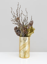 For events that call for a touch of nature, you'll love our palm etched gold mercury glass cylinder vase. The radiant gold finish adds a touch of opulence, casting a warm and inviting glow wherever it is placed. Whether used as a standalone statement piece or as part of a curated arrangement, this mercury glass cylinder captivates with its lustrous surface and attention to detail. The delicate palm leaf pattern etched along the outside of the vase adds a unique detail to the glass. Our leaf etched mercury glass vases are well suited for a variety of décor styles, whether rustic, vintage, or outdoor elegance.