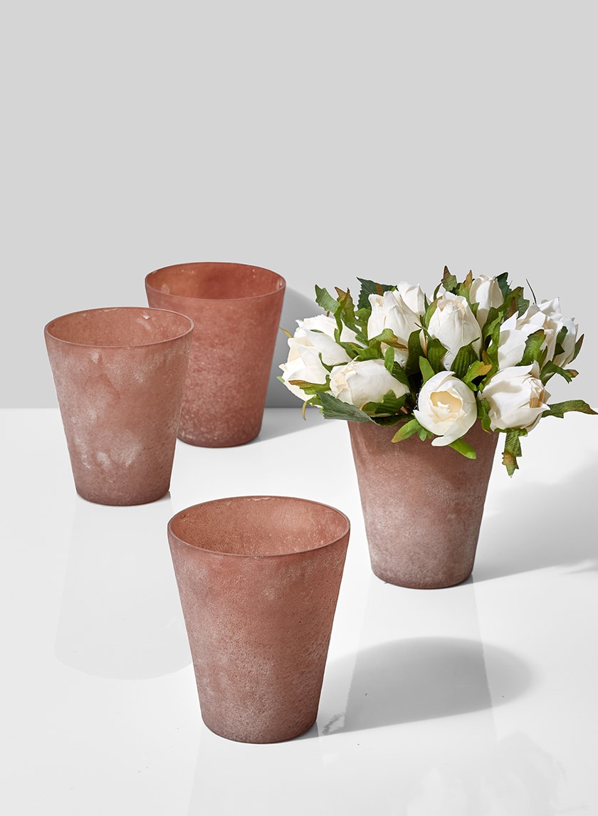 Terracotta is a traditional finish for planters and pots, but our unique terracotta frost watercolor glass vases present a new twist on the classic look. These 4-inch tall glass vases feature an ethereal frosted terracotta-toned finish that is both subtle and sophisticated. Available in sets of four, these vases make the perfect addition to event decor. They can serve as decorations for smaller spaces or as part of a larger display for a centerpiece or tablescape.