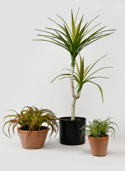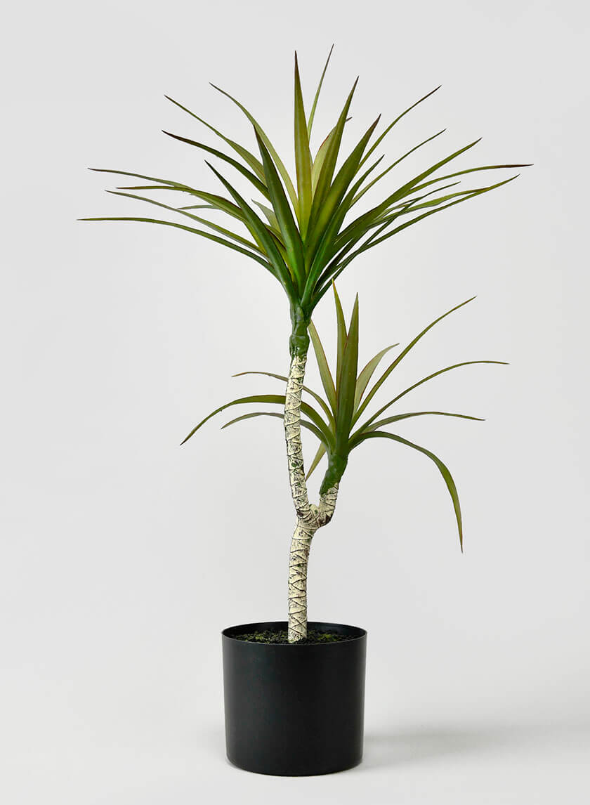 You'll love the look of this yucca reproduction. With its airy look created by a slim stem that branches out into two and each ending in a dome of yucca leaves, this faux yucca plant can be on the floor, sit in a windowsill, be displayed on a tabletop, and look fantastic in each. This artificial plant comes as shown in the round, black plastic pot. On a table or console, or on building's large lobby desk, we love it paired with our potted tillandsias. Drop this fake yucca plant in a terracotta planter to match theirs.