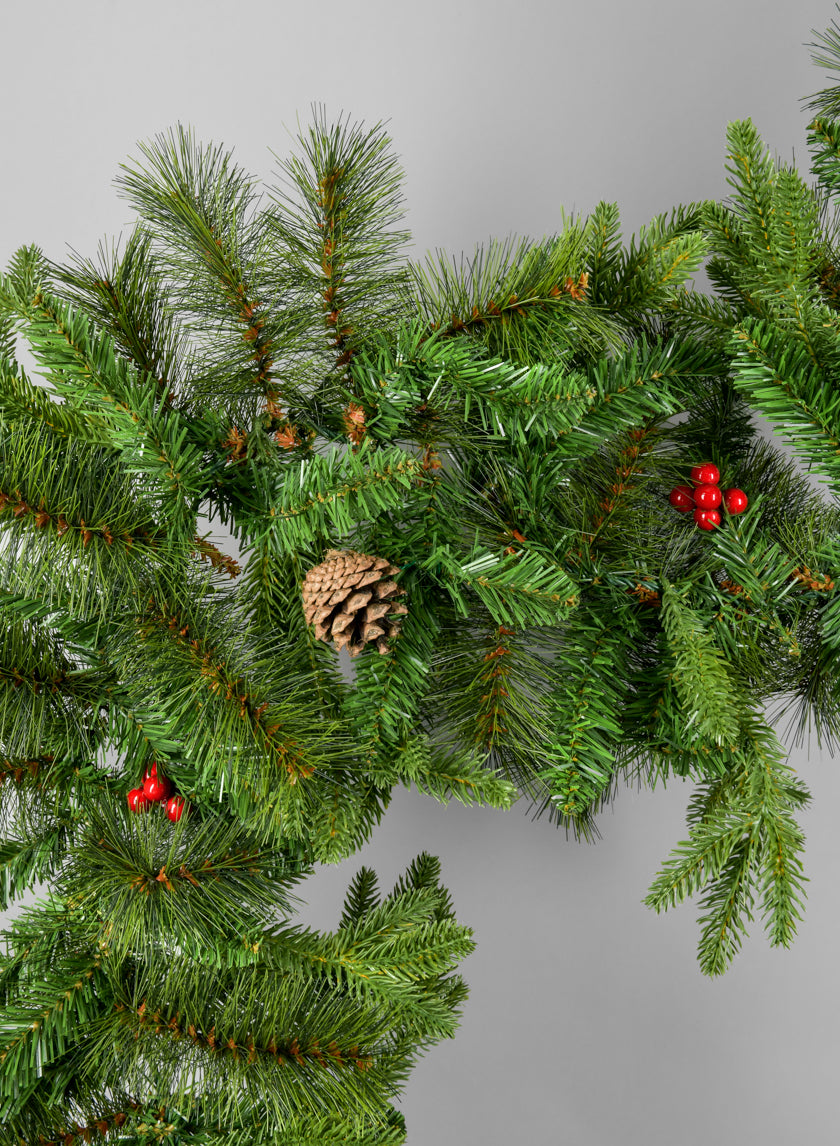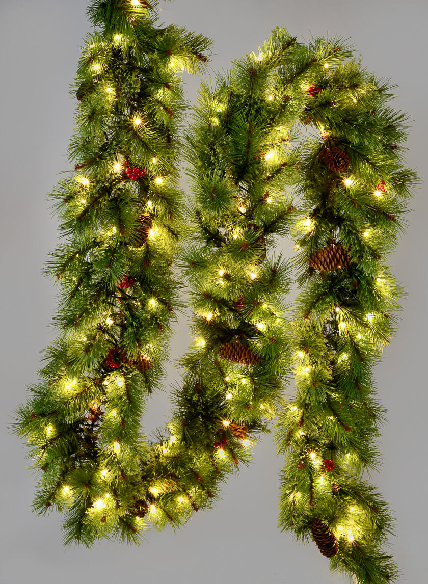 9ft Long Pine Garland With 150 LED Lights, Pine Cones & Berries
