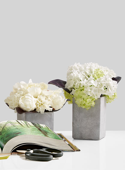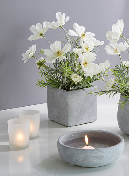 The cement cube vase is the perfect vessel for your wedding or event decor theme. We love how it looks with rosemary sprigs and white flowers. It's a clean appearance suited for an outdoor summer wedding. To use the cement look throughout your decor, arrange this vase with a cement vase and cement bowl.