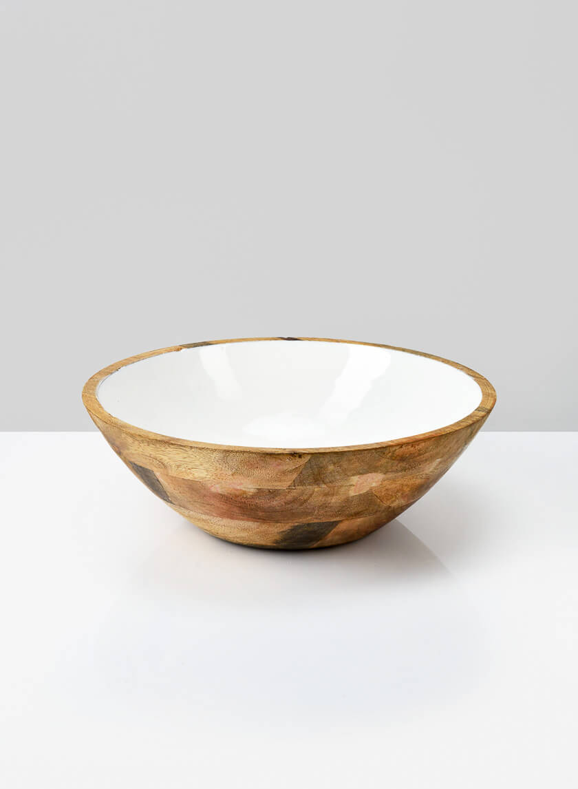 A white enameled inside makes it easy to use this mango wood bowl as is for your fresh flower arrangement. It also adds a clean contrast if you'd like to use the bowl for displaying dry goods, as a fruit bowl on a dining table, or for an ikebana-inspired floral arrangement with a pin frog to hold your flowers. For smaller tables or smaller florals, there is this set of matching 6-inch mango wood bowls.
