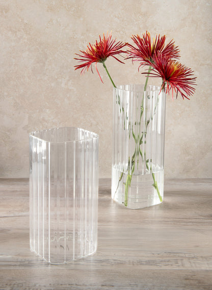 A captivating blend of contemporary style and timeless craftsmanship. This vase features a unique rounded square shape with a ribbed texture depth and dimension to its sleek silhouette. Its minimalist yet striking design makes it a versatile addition to interior styles, from modern to transitional. The ribbed detailing catches the light, adding subtle texture and visual interest to any space.