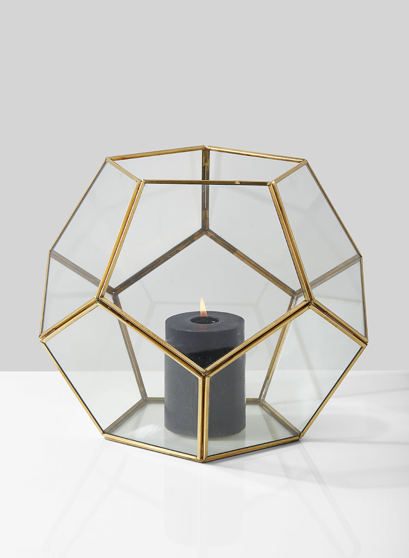 Pair this honeycomb candleholder with its smaller, matching cousin, for a unique table centerpiece. Or add low floral arrangements in antique gold bowls. The gold pentagon frames holding clear glass come together to make this honeycomb-shaped candleholder. This larger size can hold two 3-inch diameter candles; a black candle creates a pretty contrast against the gold frame.