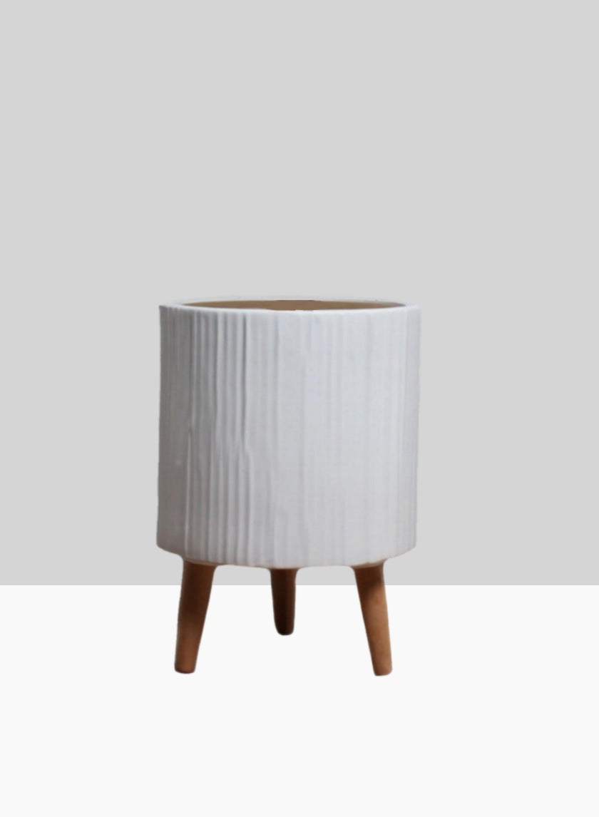 15.75in Tall Ripple Matte White Ceramic Planter With Wood Legs