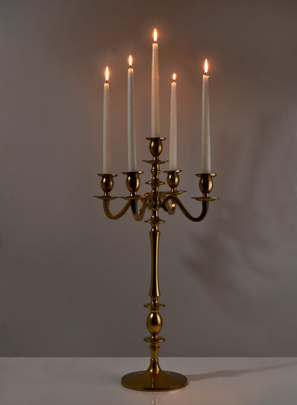 For an edgy modern look, combine the gold candelabras and candlesticks with black taper candlesglittered white feather peonies in a gold bud vase, and black crystal ornaments for extra flair. For traditional elegance, use ivory taper candles and a festonne petillant classic glass vase with a light pink flower bouquet or pink butterfly orchids. With these accessories, the gold candlestick holder will look exquisite at glamorous events.