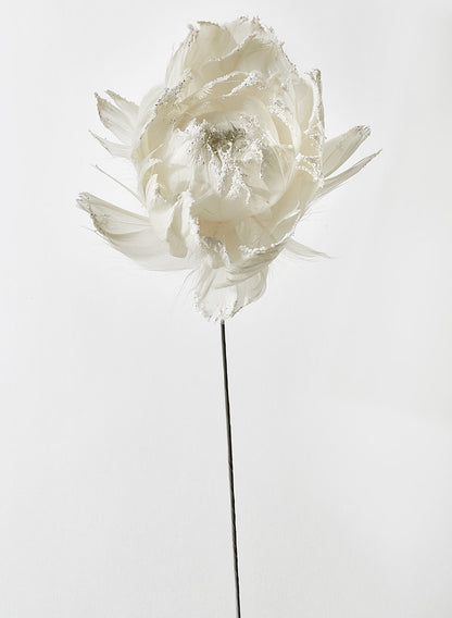 Look at this beauty! Perfect, and unique, for a Christmas dinner centerpiece, this white feather peony is accented with bits of faux snow and delicate silver glitter for some holiday sparkle. Also consider using it at a white wedding, a winter wedding, or a black and white wedding, even in the bride's bouquet. When you combine it with our other two feather peonies you'll get a more realistic look to your bouquet or arrangement.