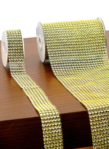 Enhance your decor with our 1in & 4 3/4in Gold Diamond Bead Ribbons, featuring faceted metal beads on a gold backing that shimmer like colored gems. Perfect for holiday decorations, gift wrapping, and adding a touch of elegance to Christmas trees, these ribbons bring a luxurious finish to any project.