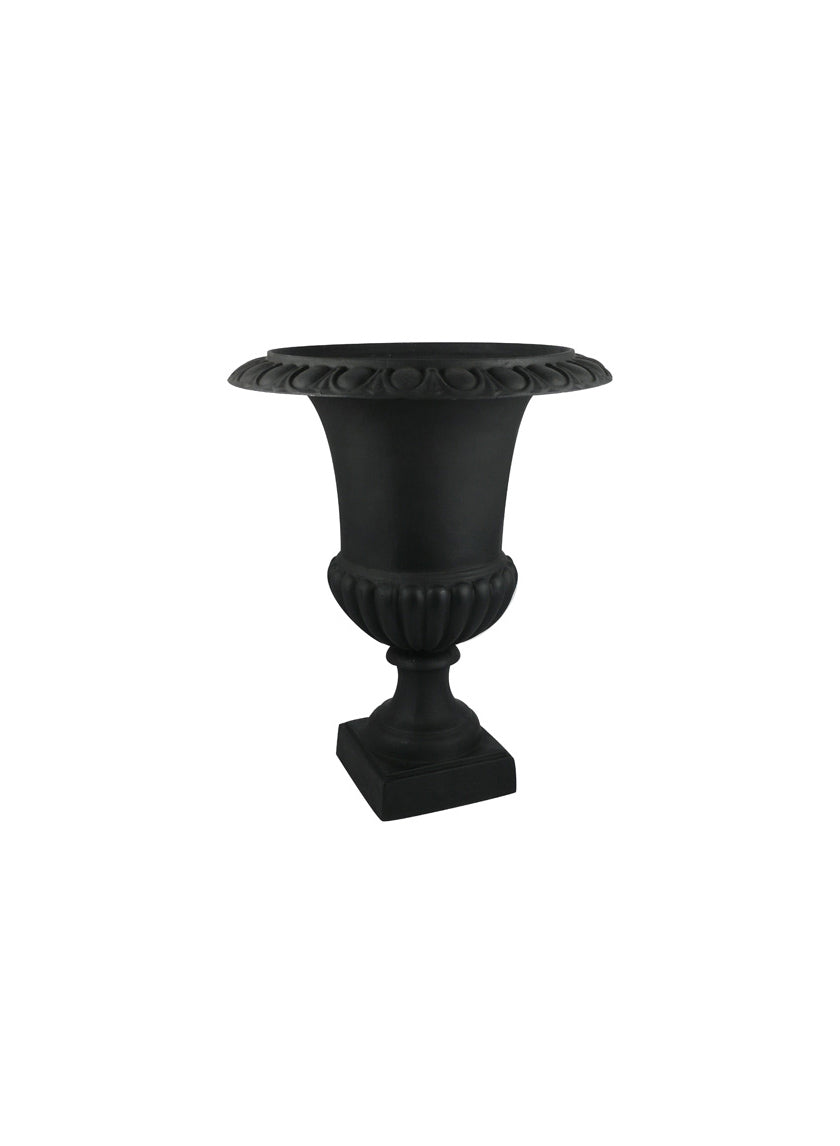 This large, black fiberglass urn has a smooth body, with a ribbed pattern at the bottom of its bowl and a classic motif at its curved top edge. Make it part of a classic garden design with our other matching urns, or use it for a large floral arrangement for a building or hotel lobby, wedding ceremony, or event.