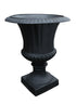 This black fiberglass urn has classic details: a ribbed-pattern body, a detailed motif around its top edge, all resting on a curvy pedestal. Pair it with its matching black pedestal to give your garden or floral designs some height, when you use them for a garden party or wedding ceremony.