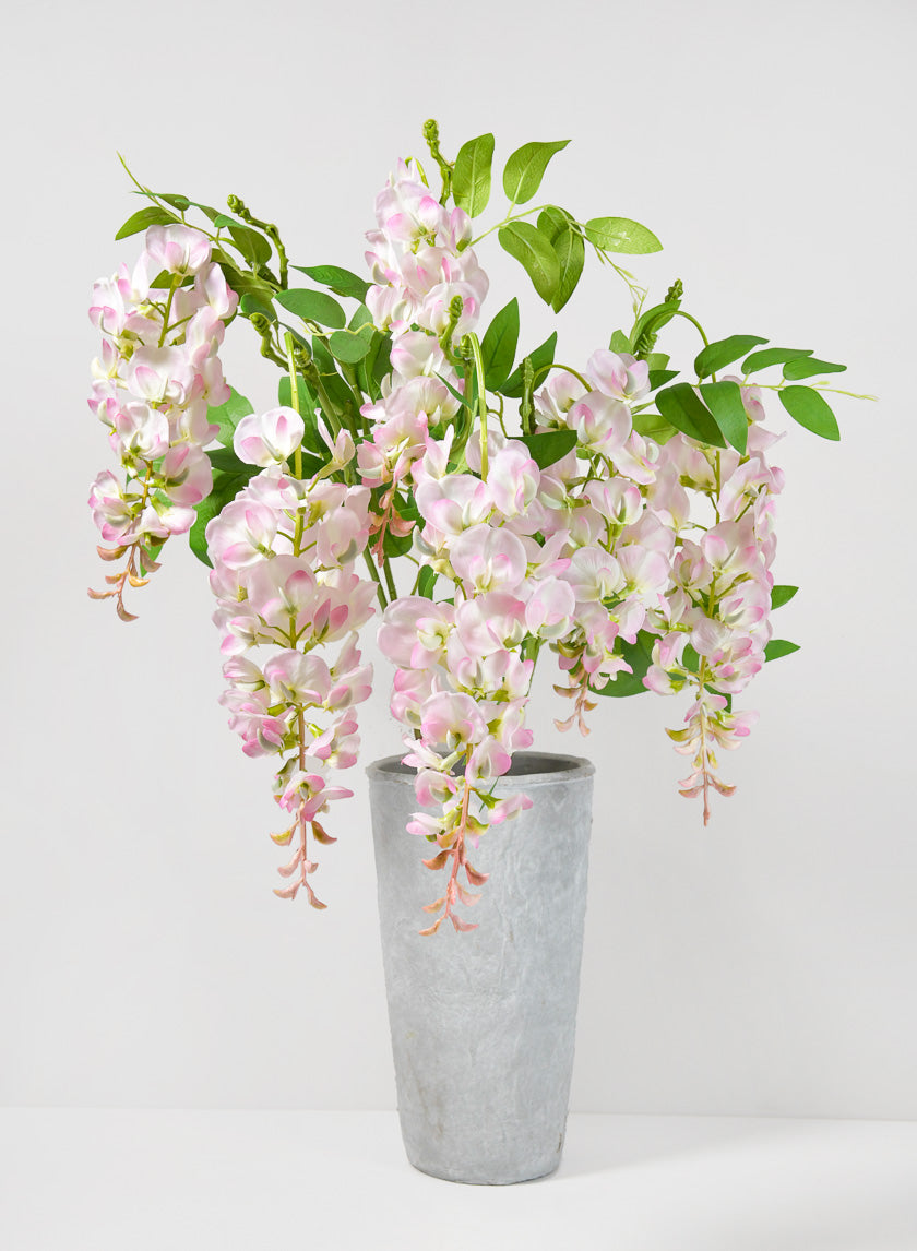 Soft and dreamy is what comes to mind when thinking of this 37-inch Pink Wisteria Spray, a selection from our Silk Flowers collection. Wisteria, with its enchanting blooms, symbolizes love and the welcoming of new beginnings. Renowned for its draping beauty and deep cultural significance of passionate affection, this silk spray encapsulates the essence of pink wisteria's alluring charm. Its cascading pink blossoms offer a visually stunning effect, ideal for crafting breathtaking installations, enhancing celebratory environments, or bringing a serene, botanical touch to interior designs. Whether for a lavish wedding or to enrich your office space, this pink wisteria spray adds a layer of romantic elegance and invites a blooming garden indoors.