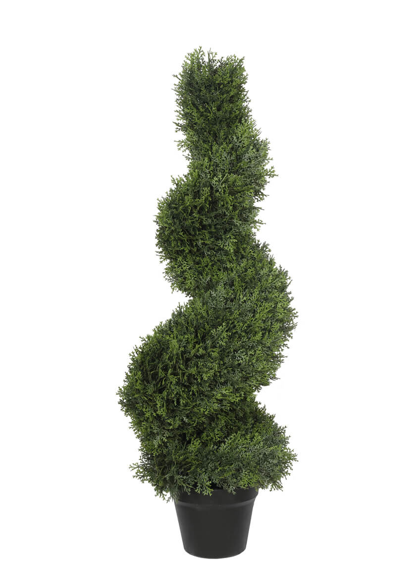 Add the spirit of Christmas to your store windows or holiday retail displays with this faux cypress spiral tree. This decorative tree is easy to put on tabletops too; use it on holiday dinner tables with other mercury glass tabletop trees, glass vases filled with Christmas ornaments, and pillar candles for a unique holiday dinner tablescape.This artificial cypress comes in the standard black plastic pot shown. It is ready to be displayed as is, or choose a different decorative planter to match your color scheme or decorating styles from our large collection of pots and planters.